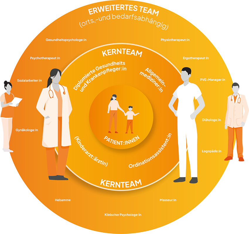 Das Kernteam einer PVE hat jedenfalls aus mindestens zwei Ärztinnen/Ärzten für Allgemeinmedizin, mindestens einem Angehörigen des gehobenen Dienstes für Gesundheits- und Krankenpflege und einem/einer Ordinationsassistent:in zu bestehen.